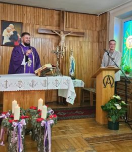 Dzisiaj mieszkańcy Domu Pomocy Społecznej podziękowali kapelanowi Łukaszowi Urbanowi, który przejął nowe obowiązki w innej parafii Wręczając kwiaty życzyli by Chrystus, Dobry Pasterz, prowadził Księdza drogą pełną radości i duchowego